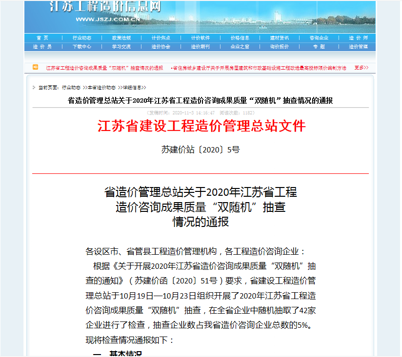 江苏省建设工程造价管理总站于10月19日—10月23日组织开展了2020年江苏省工程造价咨询成果质量“双随机”抽查,在全省企业中随机抽取了42家企业进行了检查,检查结论分为“良好”、“合格”和“不合格”。我公司在本次抽查中结果“良好”,取得...