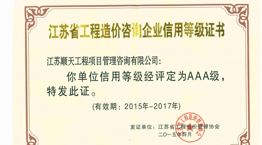 通过各部门的努力,我公司2017年12月被评为2015—2017年度江苏省工程造价咨询企业信用AAAA级,由江苏省工程造价管理协会颁发证书,有效期为2018年1月—2020年12月。